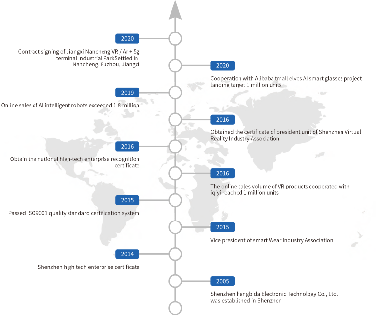 Founded in 2005, hengbida is a company focusing on the research and development of VR / Ar / AI intelligent consumer electronic hardwar As an enterprise integrating manufacturing and sales, it is also a Chinese high-tech enterprise and Shenzhen Virtual Reality Industry Association President unit and executive vice president unit of Shenzhen intelligent wearable industry. In 2020, in Nancheng, Fuzhou City, Jiangxi Province Jiangxi hengbida Industrial Co., Ltd. was established in the county, and a virtual reality 5g Industrial Park was established, with an area of 110000 square meters Meter workshop, self owned SMT patch, open mold injection molding, professional assembly, 100 grade dust-free VR workshop, testing and inspection center , engineering technology R & D and other departments, the company continues to introduce a large number of high-tech talents for independent R & D It is the first intelligent product in the industry, with more than 40 inventions and various patents.